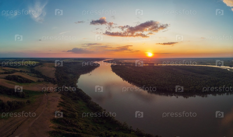 Вид с воздуха с беспилотника на речной пейзаж солнечным летним вечером