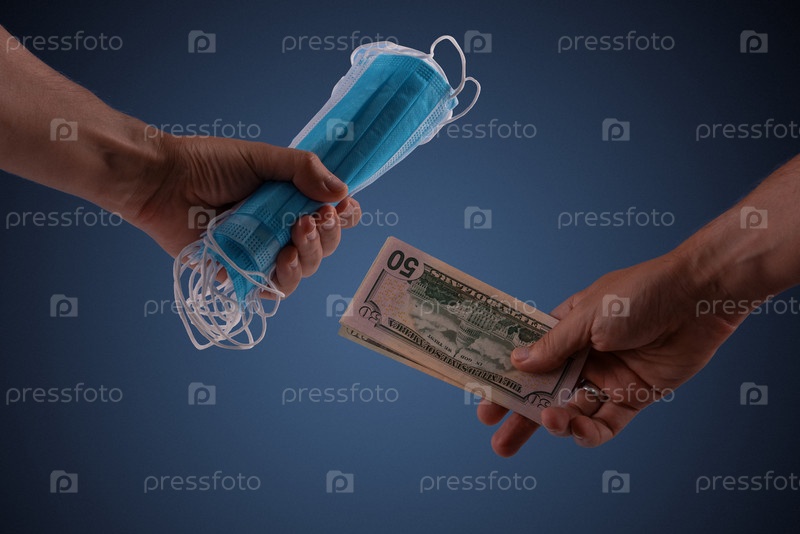 Продать - купить концепцию медицинской маски для лица. Руки держат защитные маски для лица и много долларов США банкноты в