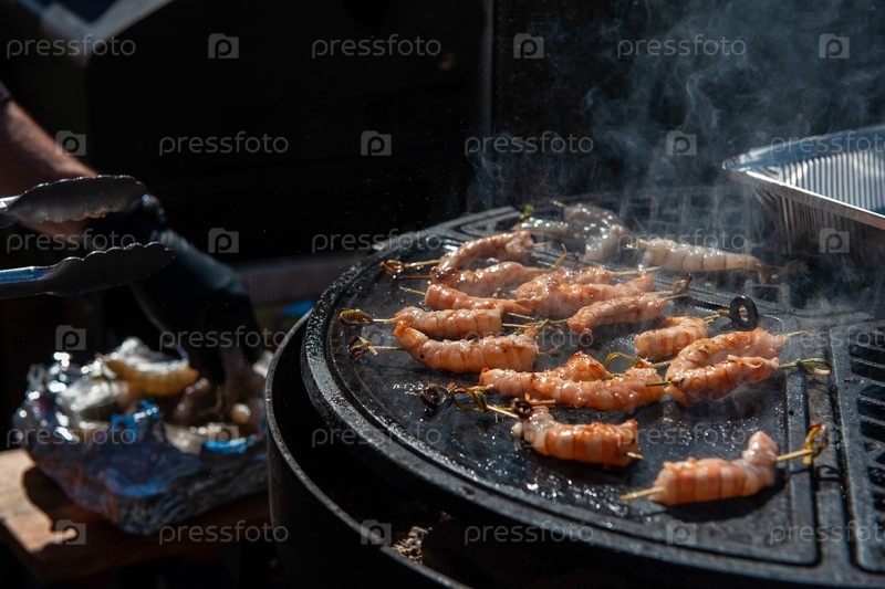 Профессиональный повар готовит креветки на гриле на открытом воздухе, концепция питания или кейтеринга