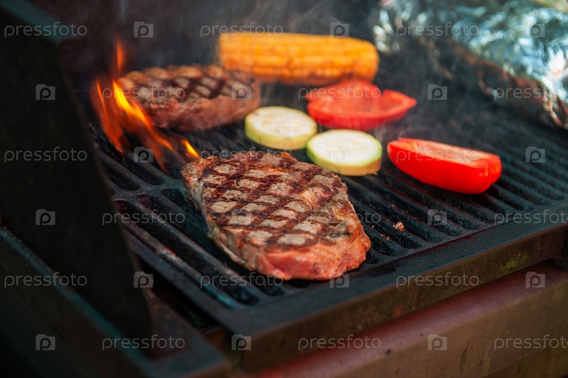 Говяжьи стейки с овощами на гриле с открытым пламенем