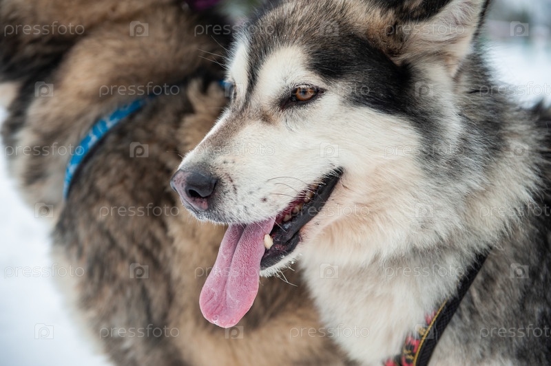 Портрет аляскинского маламута крупным планом в зимний сезон
