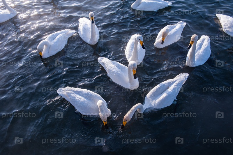 Красивые белые лебеди-кликуны плавают в незамерзающем зимнем озере. Место зимовки лебедей, Алтай, Сибирь, Россия
