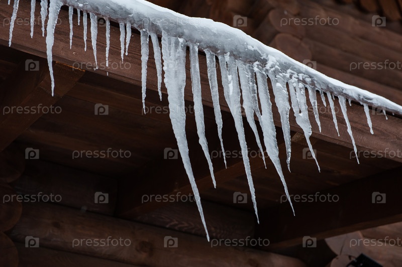 Фотография крупным планом сосулек, свисающих с крыши деревянного дома