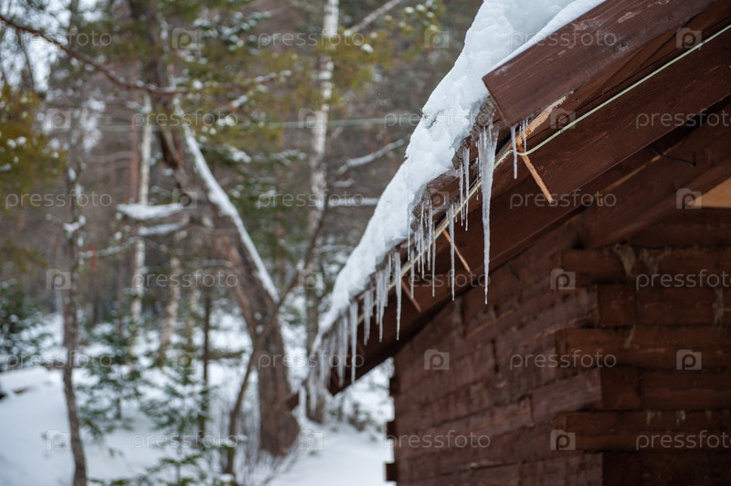 Фотография крупным планом сосулек, свисающих с крыши деревянного дома