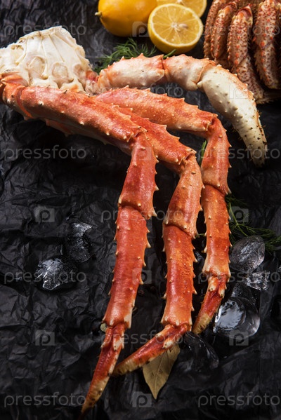 Набор морепродуктов: красная и черная икра, конечность волосатого краба, конечность краба-стригуна, дальневосточный камчатский краб