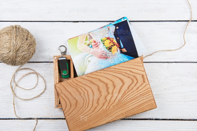 Деревянная фотокоробка со свадебной фотографией на День свадьбы. Романтическая любовь и концепция дня свадьбы