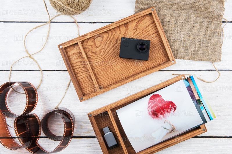Деревянная фотокоробка со свадебной фотографией на День свадьбы. Романтическая любовь и концепция дня свадьбы