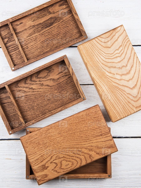 Деревянная фотокоробка для хранения фотографий на деревянном белом фоне