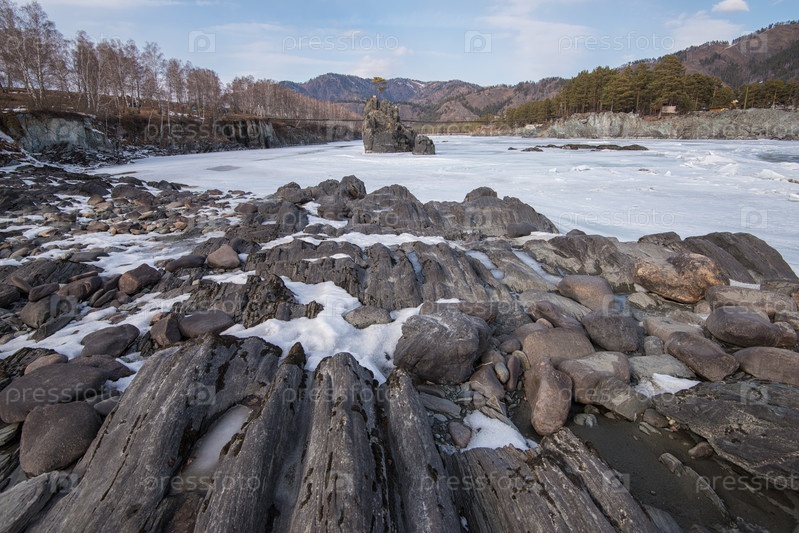 Быстрая горная река Катунь на Алтае, Сибирь, Россия. Популярное туристическое место, называемое Зубы Дракона. Красота солнечного зимнего дня