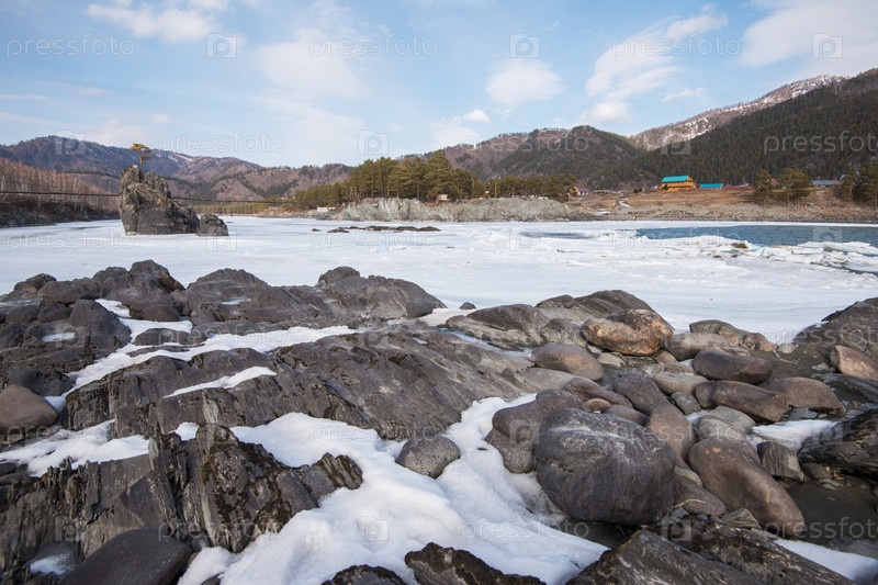 Быстрая горная река Катунь на Алтае, Сибирь, Россия. Популярное туристическое место, называемое Зубы Дракона. Красота солнечного зимнего дня