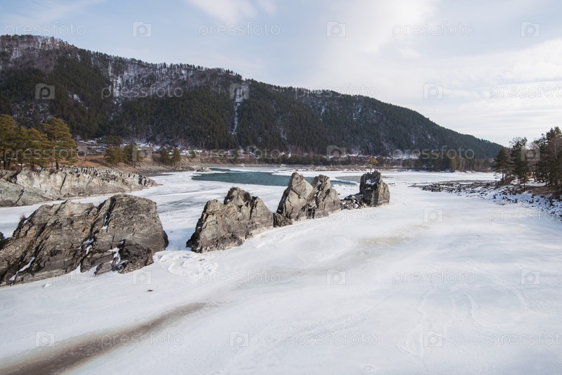 Быстрая горная река Катунь на Алтае, Сибирь, Россия. Популярное туристическое место, называемое Зубы Дракона. Красота солнечного зимнего дня