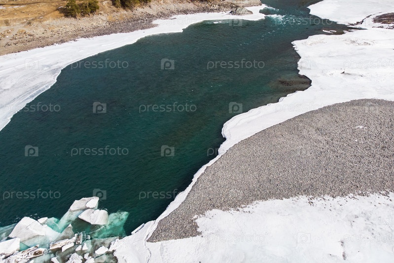 Вид с воздуха на зимние голубые озера в горах Алтая