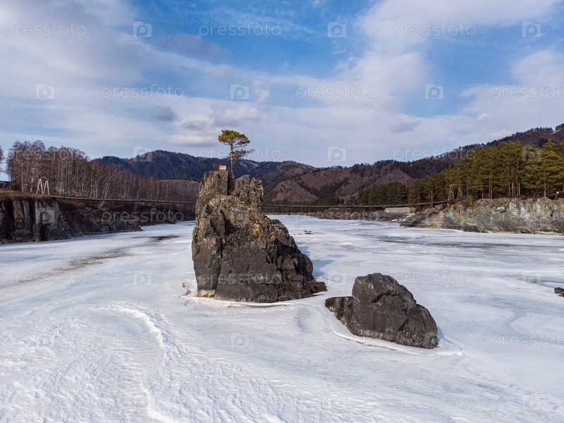 Быстрая горная река Катунь на Алтае, Сибирь, Россия. Популярное туристическое место, называемое Зубы Дракона. Красота солнечного зимнего дня