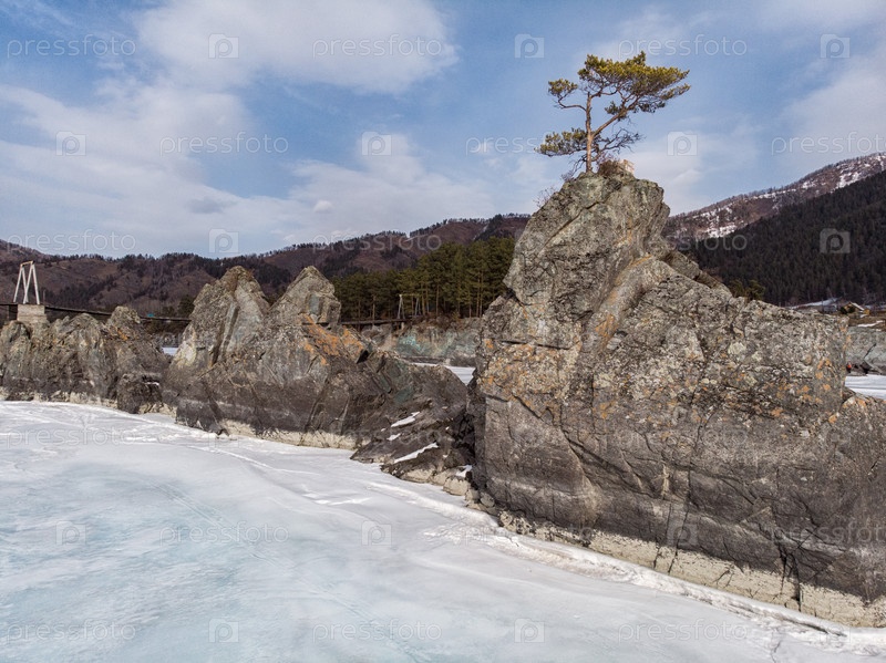 Быстрая горная река Катунь на Алтае, Сибирь, Россия. Популярное туристическое место, называемое Зубы Дракона. Красота солнечного зимнего дня