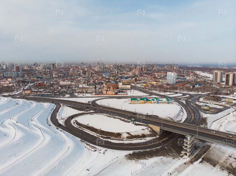 Аэрофотоснимок моста и проезжающего по нему автомобиля, зимний солнечный день в Барнауле, Сибирь, Россия