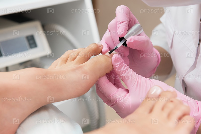 Процедура педикюра в салоне красоты. Полировка ногтей лаком. Крупным планом фото