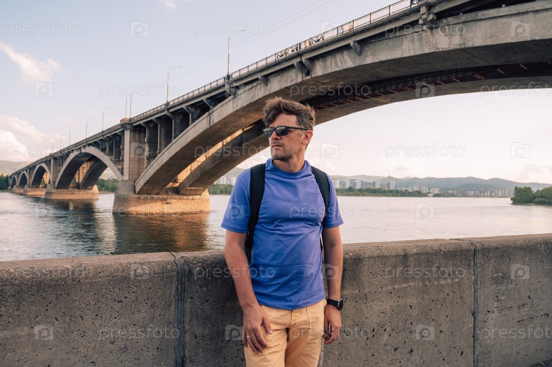 Счастливая семья фотографируется на фоне реки Енисей в прекрасный солнечный летний день в Красноярске