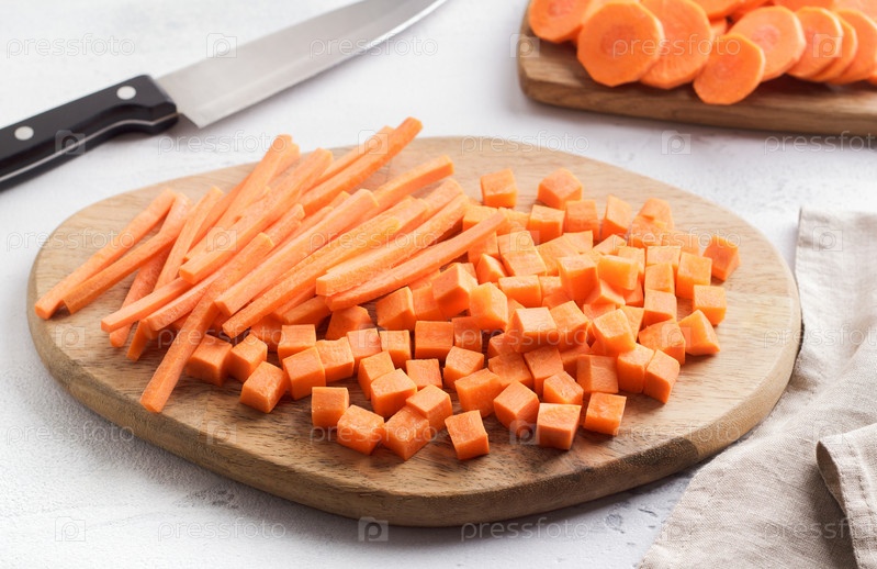 Кубики и палочки свежей спелой моркови на деревянной доске, два вида нарезки овощей. Здоровое диетическое питание