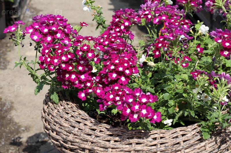 Красные и белые вегетативные цветы вербены в искусственном ротанговом горшке