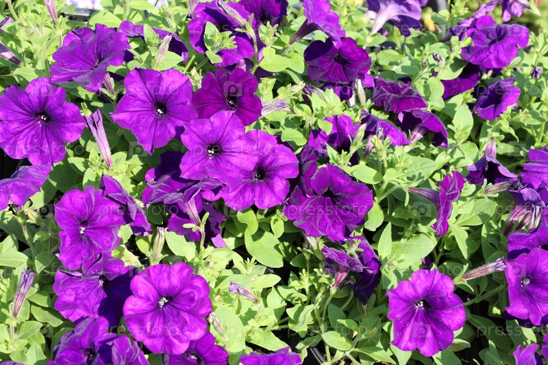 Насыщенный фиолетовый цвет петуний великолепно смотрится на зеленом фоне