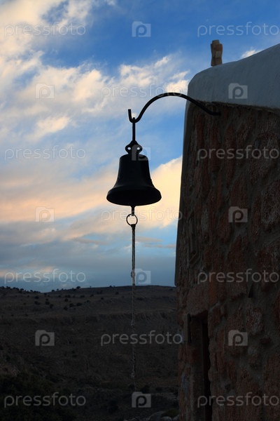 Колокол на маленькой церкви перед рассветом. Поселок Пефки. Родос, Греция