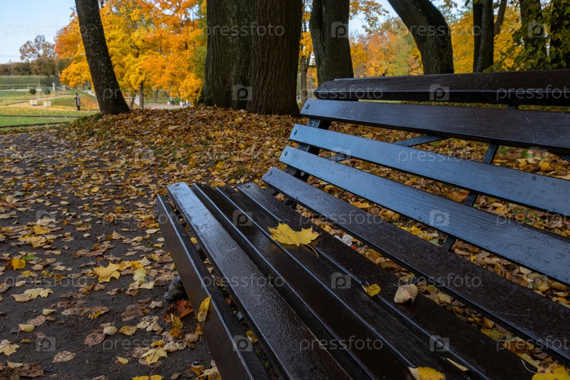 Пустая скамейка в парке в золотую осень. Избирательный фокус