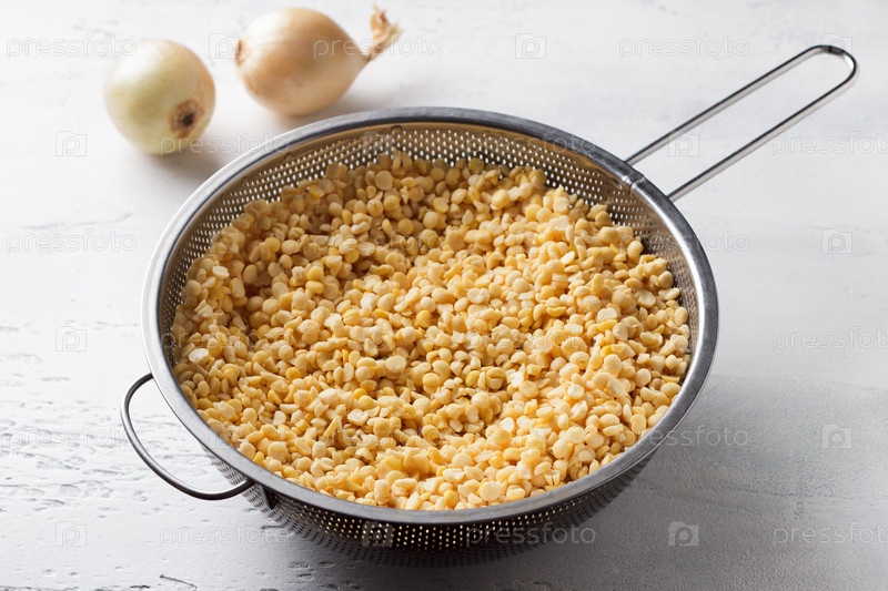 Желтый замоченный горох в металлическом дуршлаге и лук, стадия приготовления, на светло-сером фоне