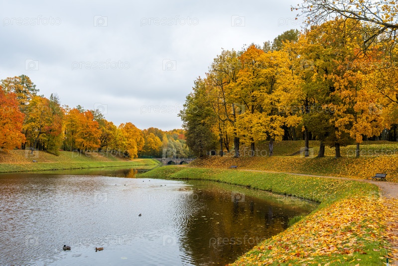 Красивый осенний пейзаж. Городской парк с прудом осенью. Выборочный фокус