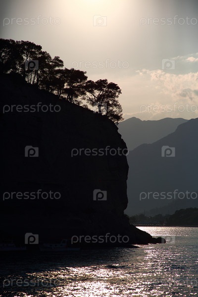 Высокий утес с соснами над морем в контровом свете. Кемер, Турция