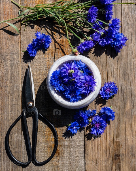 Синие васильки в вазе для медицинских и косметических средств на деревянном столе. васильки, лежащие на деревянном столе. ярких синие васильки на деревянном столе в деревенском стиле с разбросанными лепестками
