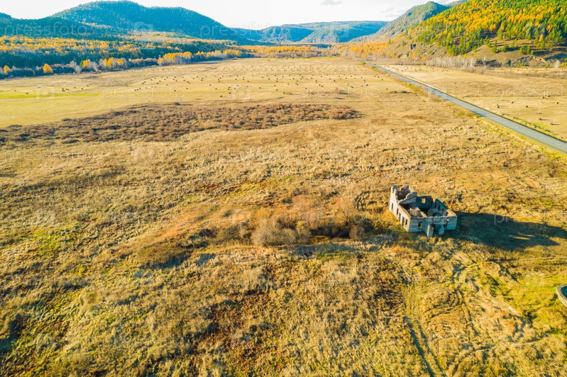 Осенний пейзаж с высоты птичьего полета. Вид с высоты птичьего полета на поля, сельскохозяйственные угодья. поле со стогами сена. Живописная деревушка и холмы на заднем плане. сельскохозяйственные поля в осенний день