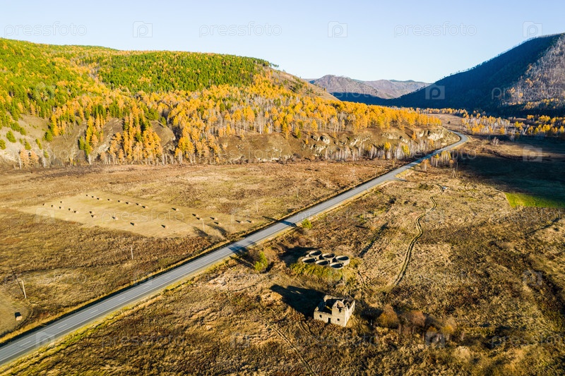 Осенний пейзаж с высоты птичьего полета. Вид с высоты птичьего полета на поля, сельскохозяйственные угодья. поле со стогами сена. Живописная деревушка и холмы на заднем плане. сельскохозяйственные поля в осенний день