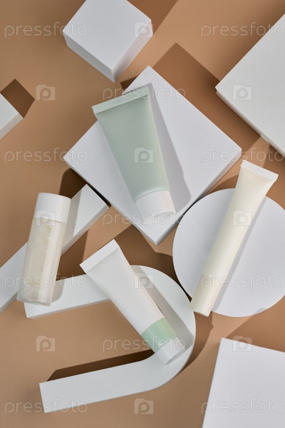Упаковка косметики. Набор различных косметических баночек и тюбиков крема на белых подиумах. Пустая упаковка. Концепция натурального спа-продукта красоты. Красота. Макет. Вид сверху