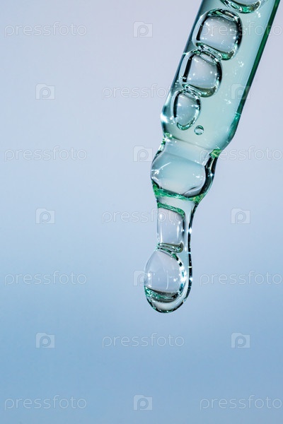 Косметическая пипетка с пузырьками крупным планом, изолированная на синем фоне