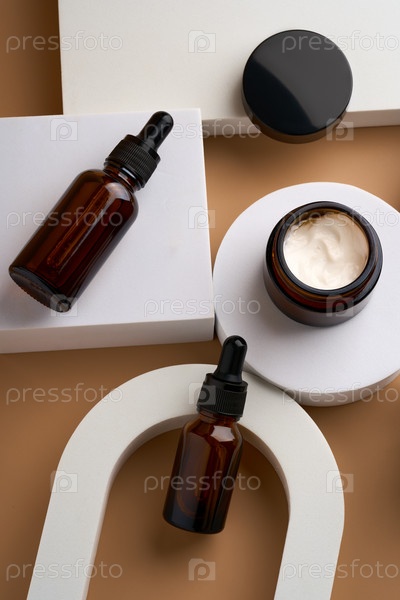 Антивозрастная коллагеновая сыворотка для лица в темном стеклянном флаконе и крем для лица на белых подиумах с пространством для текста. Концепция натуральной органической косметики. Макет для брендинга
