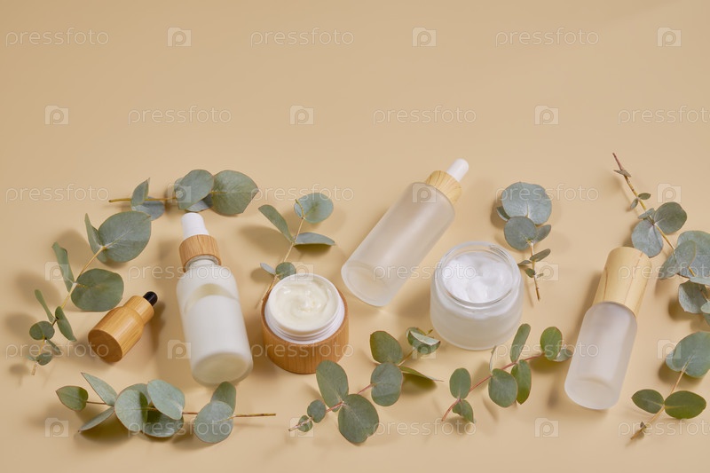 Естественная косметика в стеклянной упаковке из бамбука на белом фоне. Набор органических косметических средств SPA. Концепция ухода за кожей