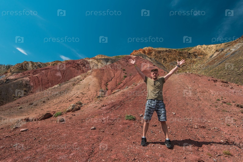 Отдыхающий мужчина в долине Марса, пейзажи Алтайских гор, Кызыл-Чин, Сибирь, Россия