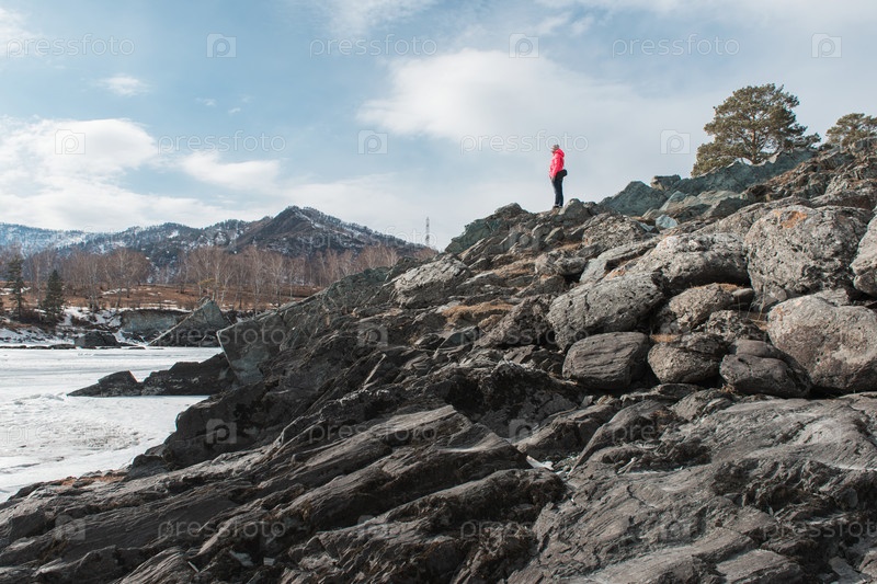 Счастливая женщина отдыхает на вершине горы в прекрасный солнечный весенний день, в горах Алтая. Концепция путешествия и отпуска