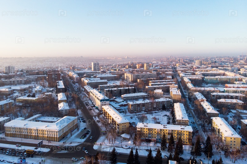 Вид с воздуха на красочный морозный зимний вечер и жилые кварталы Барнаула