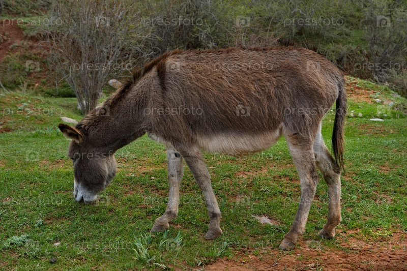 Кыргызстан, юго-восточное побережье озера Иссык-Куль. Бесстрашный домашний осел пасется на дороге у Красных скал Джети-Огуз