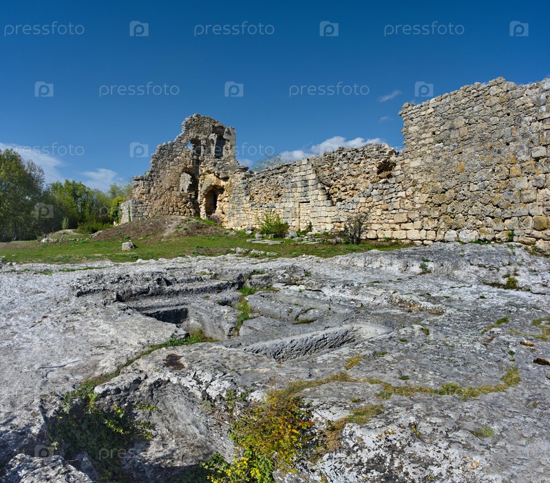 Вид на фрагменты полуразрушенной каменной крепости знаменитого пятигорского города Мангуп-Кале V века в Бахчисарайском районе