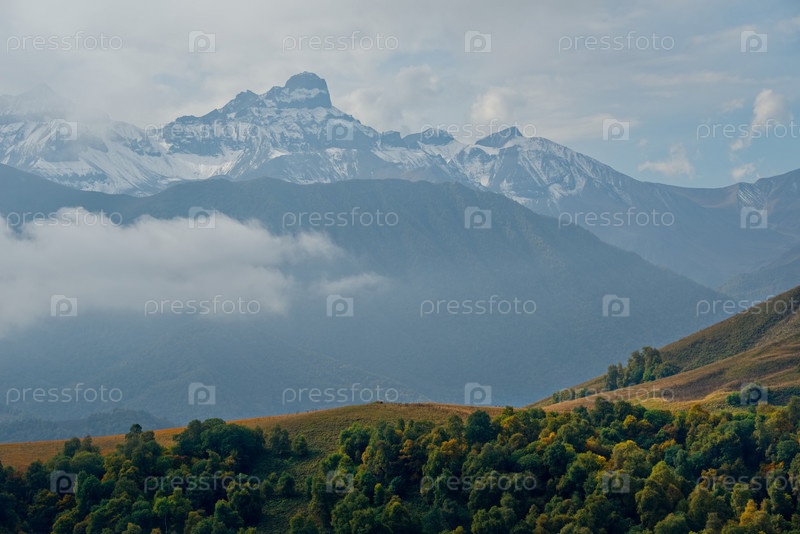 Россия. Приэльбрусье. Высокие горные вершины Северного Кавказа окутаны утренним туманом, парящим на разных уровнях неприступных скал