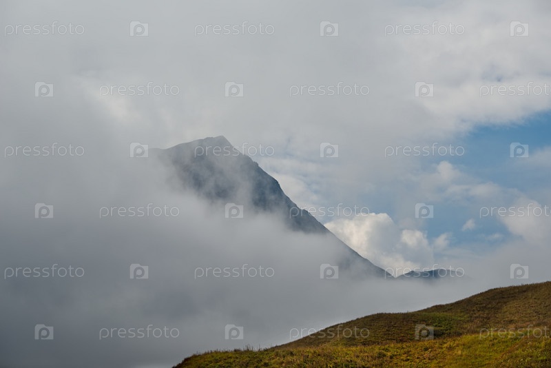 Россия. Приэльбрусье. Высокие горные вершины Северного Кавказа окутаны утренним туманом, парящим на разных уровнях неприступных скал