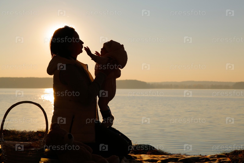 Красивый и трогательный силуэт матери и ее ребенка, наслаждающихся восходом солнца у спокойной воды