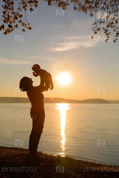 Трогательный силуэт, изображающий любящего родителя, держащего на руках веселого ребенка на закате у спокойной воды