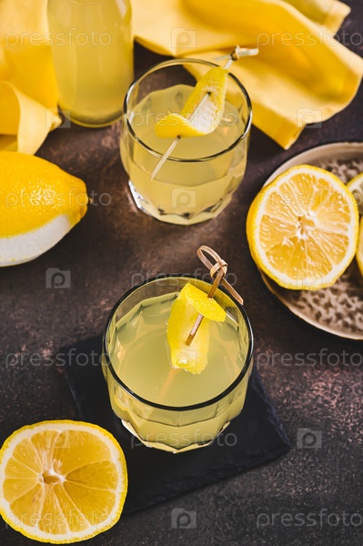 Два бокала итальянского лимончелло и лимоны на столе вертикальный вид