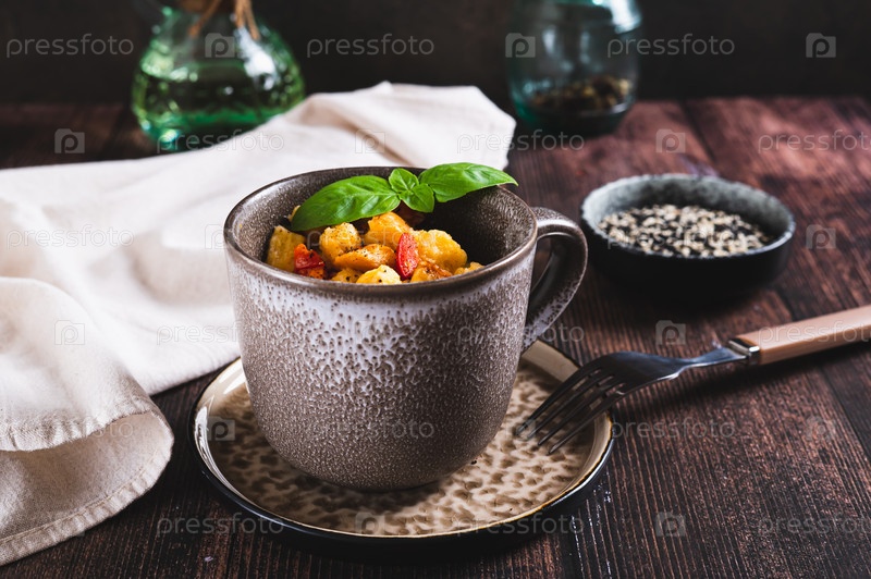 Хлебный пудинг с яйцом, перцем и базиликом в чашке на столе