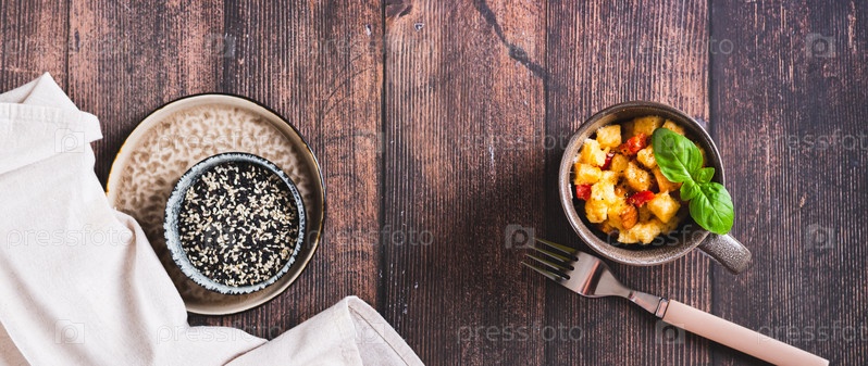 Белый хлебный пудинг с яйцом, сыром и перцем в чашке на столешнице веб-баннер