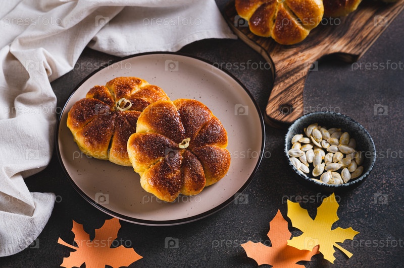 Осенние булочки в форме тыквы, посыпанные сахаром, на тарелке на столе