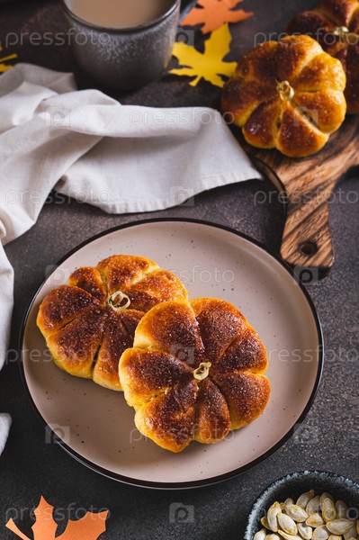 Осенние булочки в форме тыквы, посыпанные сахаром, на тарелке на столе, вертикальный вид
